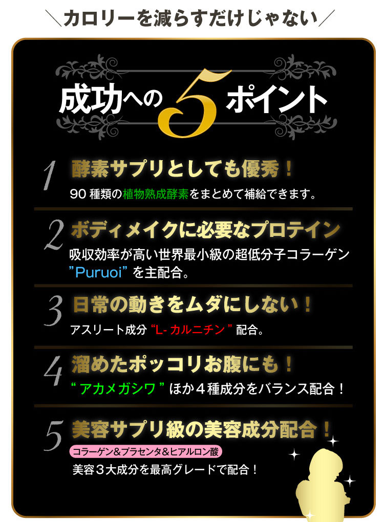 コラーゲンペプチド(魚由来)、エリスリトール、 L-カルニチンフマル酸塩、アカメガシワエキス末、植物発酵 エキス末(デキストリン、オリゴ糖、砂糖、てんさい糖、ヨモギ、 その他)、食物繊維、サラシアレティキュラータエキス末、白い んげん豆エキス末、乳酸菌末(殺菌乳酸菌、デキストリン)、 ガルシニアエキス末、豚胎盤エキス末、酸味料(リンゴ酸)、 香料、着色料(アントシアニン)、甘味料(アスパルテーム・L- フェニルアラニン化合物、スクラロース)、卵殻カルシウム、ヒ アルロン酸、(原材料の一部に乳、豚肉、りんご、やまいもを含む)