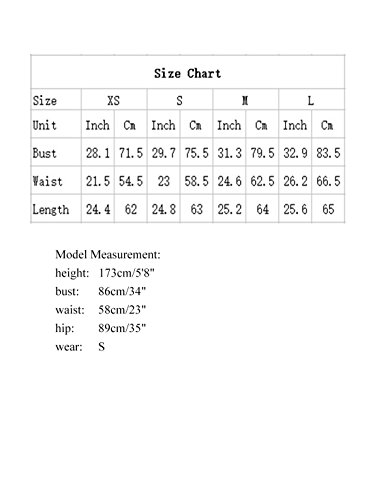 Please refer to our Size Chart(Not Amazon). Size Chart: XS: Bust: 28.1", Waist Size: 21.5", Length: 24.4" S: Bust: 29.7", Waist Size: 23.0", Length: 24.8" M: Bust: 31.3", Waist Size: 24.6", Length: 25.2" L: Bust: 32.9", Waist Size: 26.2", Length: 25.6"