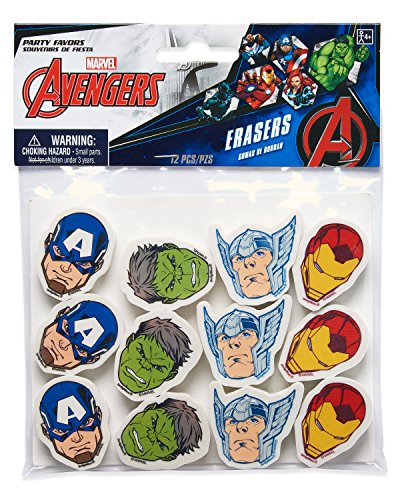 Get the action started with Marvel Avengers erasers! These epic superhero eraser designs feature such favorite characters as Captain America, Thor, Iron Man and Hulk. Package includes a total of 12 erasers (3 each of 4 designs) measuring approximately 1-1/2 in. each. Toss erasers into favor bags, scatter them on the party table as decorations or use as part of a party game or activity. They're sure to please all your superhero super fans!.Feature