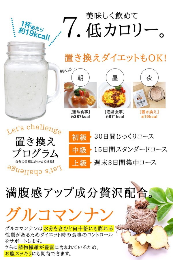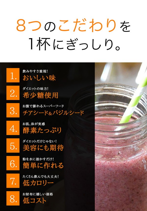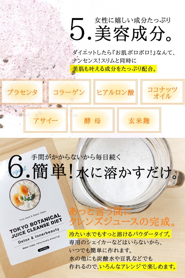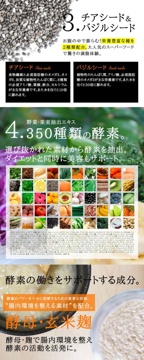 (Kiwi Green) ブドウ糖、小麦ファイバー(小麦を含む)、チアシード、水溶性食物繊維、マルトデキストリン、大麦若葉、脱脂粉乳(乳成分を含む)、ドロマイト、バジルシード、食用酵母(マンガン、亜鉛、銅、クロム、モリブデン、セレン含有)、玄米麹末、希少糖含有粉末、L-カルニチンフマル酸塩、コンニャクイモ抽出物、豚プラセンタエキス末(豚肉を含む)、コラーゲンペプチド、デキストリン、植物発酵末(大豆・りんご・やまいも・桃・オレンジ・キウイフルーツ・バナナ・カシューナッツ・ゴマを含む)、L-オルニチン塩酸塩、ココナッツオイル、穀物麹、アサイー末、ハチミツパウダー / キサンタンガム、クエン酸、香料、甘味料(アスパルテーム・L-フェニルアラニン化合物)、微粒酸化ケイ素、ヒアルロン酸、ビタミンC、ビタミンE、ナイアシン、パントテン酸Ca、ビタミンB1、ビタミンB2、ビタミンB6、ビタミンA、葉酸、ビタミンD、ビタミンB12 (Orange Carrot) ブドウ糖、小麦ファイバー(小麦を含む)、チアシード、水溶性食物繊維、マルトデキストリン、脱脂粉乳(乳成分を含む)、ドロマイト、オレンジ果汁末、野菜ミックスパウダー(大麦若葉、ケール、ブロッコリー、カボチャ、チンゲン菜、パセリ、人参、セロリ、ゴーヤ、ほうれん草、桑の葉、モロヘイヤ、よもぎ、トマト)、バジルシード、食用酵母(マンガン、亜鉛、銅、クロム、モリブデン、セレン含有)、玄米麹末、希少糖含有粉末、L-カルニチンフマル酸塩、コンニャクイモ抽出物、豚プラセンタエキス末(豚肉を含む)、コラーゲンペプチド、デキストリン、植物発酵末(大豆・りんご・やまいも・桃・オレンジ・キウイフルーツ・バナナ・カシューナッツ・ゴマを含む)、L-オルニチン塩酸塩、ココナッツオイル、穀物麹、アサイー末、ハチミツパウダー / キサンタンガム、クエン酸、香料、着色料(ビートレッド、ベニバナ黄色素)、甘味料(アスパルテーム・L-フェニルアラニン化合物)、微粒酸化ケイ素、ヒアルロン酸、ビタミンC、ビタミンE、ナイアシン、パントテン酸Ca、ビタミンB1、ビタミンB2、ビタミンB6、ビタミンA、葉酸、ビタミンD、ビタミンB12 (Berry Berry) ブドウ糖、小麦ファイバー(小麦を含む)、マルトデキストリン、チアシード、水溶性食物繊維、脱脂粉乳(乳成分を含む)、ドロマイト、ブルーベリー果汁末、バジルシード、食用酵母(マンガン、亜鉛、銅、クロム、モリブデン、セレン含有)、玄米麹末、希少糖含有粉末、L-カルニチンフマル酸塩、コンニャクイモ抽出物、豚プラセンタエキス末(豚肉を含む)、コラーゲンペプチド、デキストリン、植物発酵末(大豆・りんご・やまいも・桃・オレンジ・キウイフルーツ・バナナ・カシューナッツ・ゴマを含む)、L-オルニチン塩酸塩、ココナッツオイル、穀物麹、アサイー末、ハチミツパウダー / キサンタンガム、クエン酸、香料、着色料(ビートレッド)、甘味料(アスパルテーム・L-フェニルアラニン化合物)、微粒酸化ケイ素、ヒアルロン酸、ビタミンC、ビタミンE、ナイアシン、パントテン酸Ca、ビタミンB1、ビタミンB2、ビタミンB6、ビタミンA、葉酸、ビタミンD、ビタミンB12 (Yogurt) ブドウ糖、水溶性食物繊維、チアシード、小麦ファイバー(小麦を含む)、脱脂粉乳(乳成分を含む)、マルトデキストリン、ドロマイト、バジルシード、食用酵母(マンガン、亜鉛、銅、クロム、モリブデン、セレン含有)、玄米麹末、希少糖含有粉末、L-カルニチンフマル酸塩、コンニャクイモ抽出物、豚プラセンタエキス末(豚肉を含む)、コラーゲンペプチド、デキストリン、植物発酵末(大豆・りんご・やまいも・桃・オレンジ・キウイフルーツ・バナナ・カシューナッツ・ゴマを含む)、L-オルニチン塩酸塩、ココナッツオイル、穀物麹、アサイー末、ハチミツパウダー / キサンタンガム、香料、クエン酸、甘味料(アスパルテーム・L-フェニルアラニン化合物)、微粒酸化ケイ素、ヒアルロン酸、ビタミンC、ビタミンE、ナイアシン、パントテン酸Ca、ビタミンB1、ビタミンB2、ビタミンB6、ビタミンA、葉酸、ビタミンD、ビタミンB12 (Soy Choco Almond) ブドウ糖、水溶性食物繊維、チアシード、小麦ファイバー(小麦を含む)、脱脂粉乳(乳成分を含む)、ココアパウダー、マルトデキストリン、大豆分離たんぱく(大豆を含む)、ドロマイト、バジルシード、豆乳粉末、食用酵母(マンガン、亜鉛、銅、クロム、モリブデン、セレン含有)、玄米麹末、希少糖含有粉末、L-カルニチンフマル酸塩、コンニャクイモ抽出物、豚プラセンタエキス末(豚肉を含む)、コラーゲンペプチド、デキストリン、植物発酵末(大豆・りんご・やまいも・桃・オレンジ・キウイフルーツ・バナナ・カシューナッツ・ゴマを含む)、L-オルニチン塩酸塩、ココナッツオイル、穀物麹、アサイー末、ハチミツパウダー / キサンタンガム、香料、甘味料(アスパルテーム・L-フェニルアラニン化合物)、微粒酸化ケイ素、ヒアルロン酸、ビタミンC、ビタミンE、ナイアシン、パントテン酸Ca、ビタミン