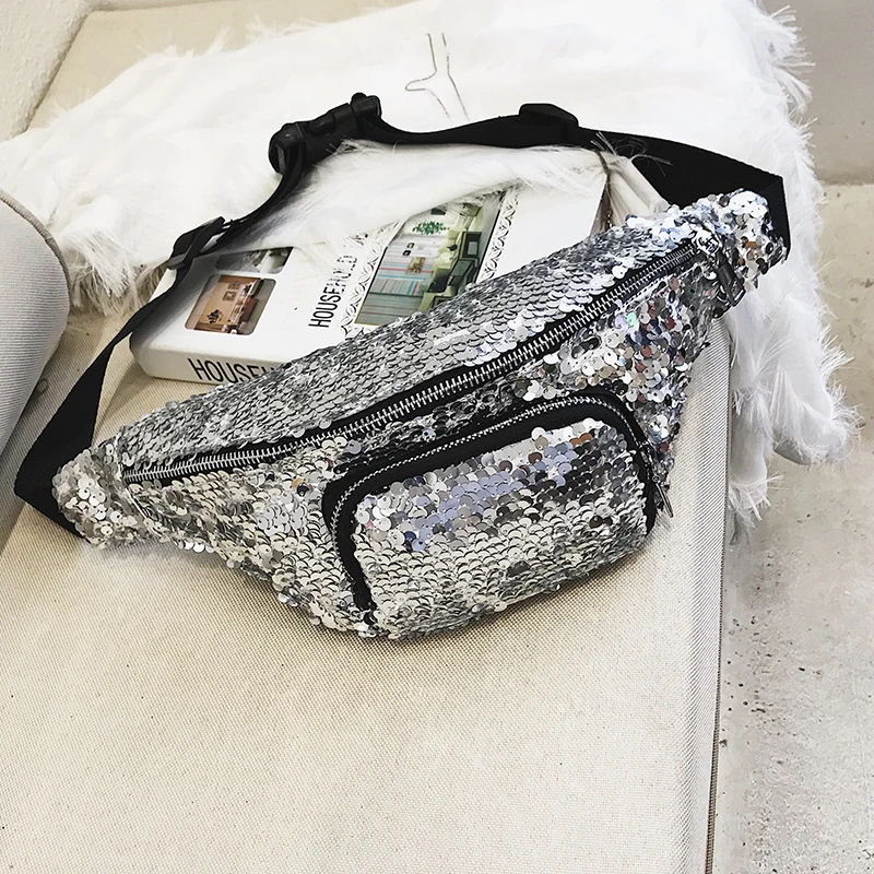 bling Leather waist packs women Silver :Fashion Reversible Sequin Glitter Waist Fanny Pack Belt Bag