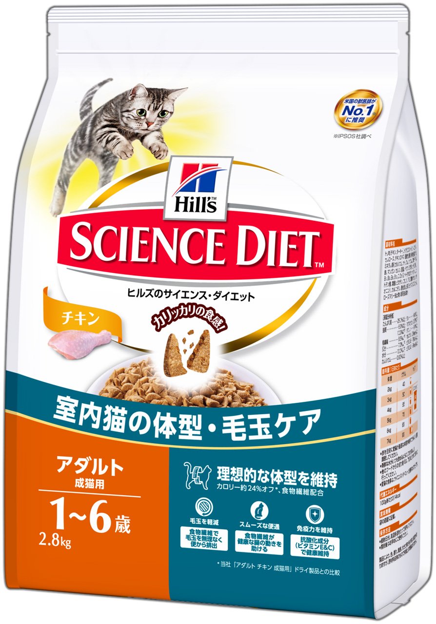 猫が大好きな味を研究。独自の「極上うま味成分」配合レシピで、夢中になるおいしさを実現。食べやすい粒の形にもこだわりました。室内猫の運動不足に配慮した栄養バランス。また、適切なレベルのカルニチンを配合し、健康な筋肉の維持を助けます。食物繊維が体内の毛の排泄を助け、室内猫の毛玉の軽減に配慮しています。科学的に証明された抗酸化成分が成猫の健康を維持し、本来の免疫力を保ちます。低脂肪、低カロリー。*食物繊維が、空腹感を与えずに健康的な体重管理をサポートします。*脂肪分約60%減、カロリー約25%減。 (当社 「アダルト チキン 成猫用」ドライ製品との比較)成猫の健康に欠かせない成分であるタウリンを十分に含み、心臓と目の健康維持をサポートします。製品の酸化を防ぐため、自然派の成分であるミックストコフェロール(ビタミンE)、ローズマリー抽出物などを使用しています。着色料は使用していません。