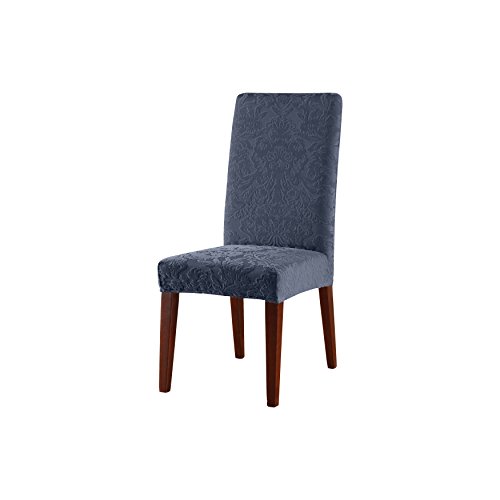 -. Brand : Surefit -. Color : Dove Gray -. EAN : 0047293446245 -. Feature : 94% Polyester / 6% Spandex / Form Fit Stretch / Made of two-way stretch knit that will follow the contours of your furniture. / Smart seam details and elastic bot help create a custom, reupholstered look. / Elastic with velcro attached to sides connect beneath seat / Measurement points for the best fit:Back width 19 Inches, Back height: 28 Inches and Seat width x depth: 17 Inches x 17 Inches -. Label : Sure Fit -. Manufacturer : Sure Fit -. Model : SF44624 -. MPN : 44624 -. PackageQuantity : 1 -. PartNumber : 44624 -. ProductGroup : Furniture -. ProductTypeName : HOME_FURNITURE_AND_DECOR -. Publisher : Sure Fit -. Size : PIllow -. Studio : Sure Fit -. Title : Sure Fit Stretch Jacquard Damask - Shorty Dining Room Chair Slipcover - French Blue (SF44624) -. UPC : 047293446245