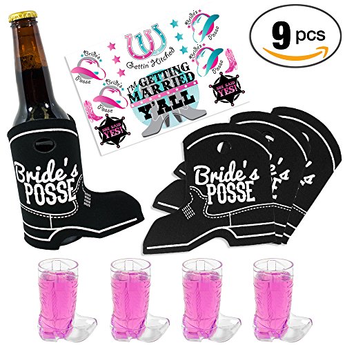 -. Feature : 9 PIECE WESTERN BACHELORETTE PARTY FAVOR KIT INCLUDES: 4 Black Book Can Covers, 4 Cowboy Boot Shot Glasses, Set of 12 Western Tattoos (1 Sheet)!
