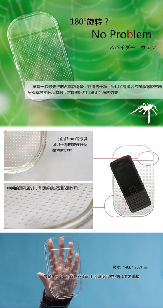 本品具有在颠簸的汽车车窗上牢牢“抓”住一部手机的魔力。你可以把它放在车内,固定你的手机、GPS导航仪、钟、笔、香水、通行卡、硬币、纸巾盒、瓶子等物品;你也可以用它来把你家里或办公室里的各类遥控器、mp3/mp4、ipod、镜子、梳子、小电子设备及其他经常要到处找的小东西固定在墙上或你想让它在的位置。此外,它还有清洁功能,你可以拿它来除去诸如键盘、电视屏幕等设备上的灰尘,用水冲洗后丝毫不降低其粘性。粘性独特,它的粘性来自于创新的硅氧烷合成及特殊的配方设计,使其表面可形成无数个微观小吸盘,它能够牢固吸住任何平面物体而又可轻松取下,但不在被粘物上留下任何痕迹,其平滑柔软的质地能带给你婴儿皮肤的感觉,难以想象它的用途会有多么广泛!