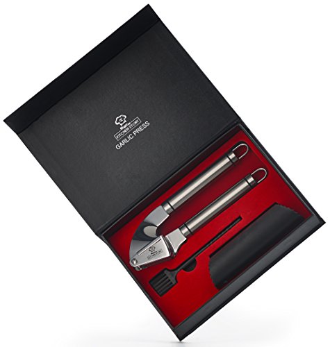 Garlic Press and Peeler Set Stainless Steel Sold in Beautiful Gift Box Garlic Mincer With Silicone Tube Roller and Cleaning Brush Easy To Clean Durable Garlic Crusher and Chopper Dishwasher Safe