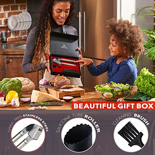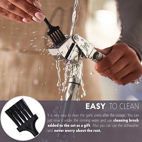 ✅ HIGH-END QUALITY & ERGONOMIC DESIGN: We use only top grade materials to make finest kitchen tools which won't rust, bend, break or weaken. Garlic presser stainless steel and silicon garlic roller are both FDA approved. The length and thickness of the handles are optimally matched to put less efforts in crush garlic. Garlic press comfortably fits the hands and the process of garlic crush becomes easy like never before.