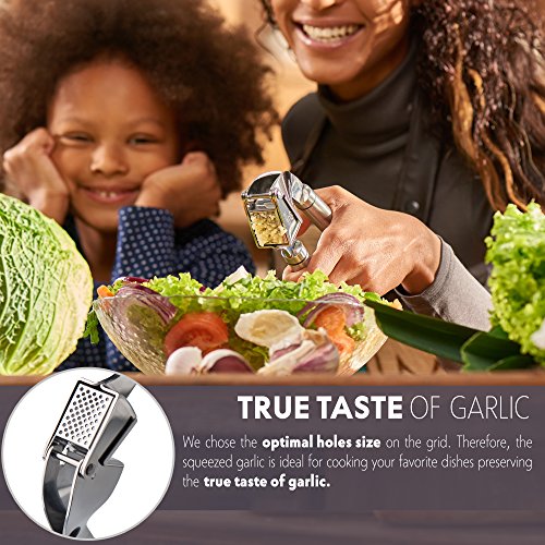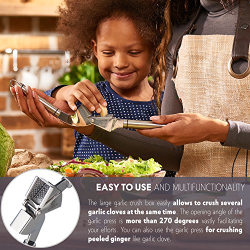 ✅ EASY TO USE & MULTIFUNCTIONALITY: Large garlic crush box easily allows to crush several garlic cloves at the same time. The opening angle of the garlic squeezer press is more than 270 degrees vastly facilitating your efforts. You can also use the garlic press for crushing peeled ginger like garlic clove. The best stainless steel garlic press for professional chefs.