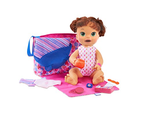 -. Feature : Use the spoon to feed your baby from the snack jar. / Keep baby clean with the pack of play baby wipes. / Change baby's shirt and diaper when things get messy. / Swaddle the baby in the blanket so she feels nice and cozy! / Give your baby the play key rings to help soothe her while she is teething! / Ages 3+ / Now your little ones can pretend to be a real mommy with the Baby Alive New Mommy On-the-Go Kit. This adorable kit features a portable and stylish diaper bag that transforms into a changing pad for when baby needs a diaper change on the go! The bag features two-sided carrying straps for easy transport and can hold all 9 mommy-essential accessories including: two diapers, one snack jar, one pack of play baby wipes, a onesie, one swaddle blanket, one pacifier, and one play key ring for when baby is teething!