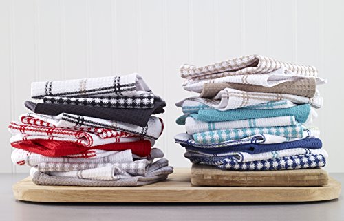 - FOUR COORDINATING DESIGNS. This waffle knit dish cloth set includes four coordinating weave designs; (1) striped, (2) checked, and (1) solid colored dish cloth. Delegate each pattern to different household tasks, or keep them together as a coordinating set in your kitchen.
