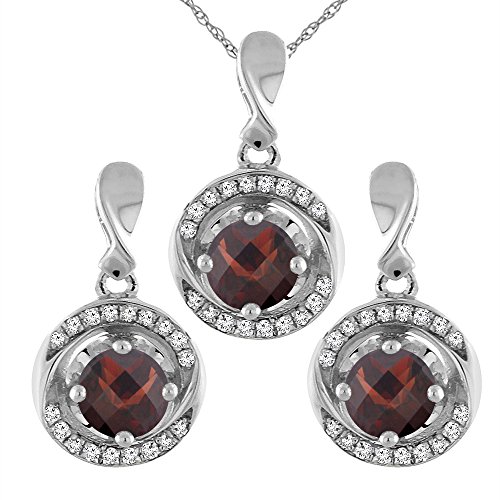 -. Title : 14K White Gold Natural Garnet Earrings and Pendant Set with Diamond Accents Round 4 mm