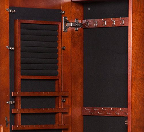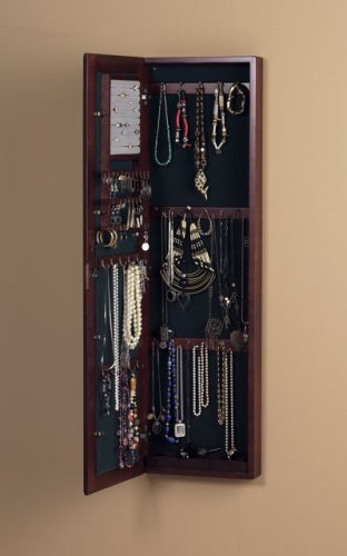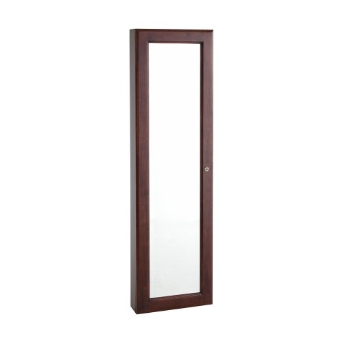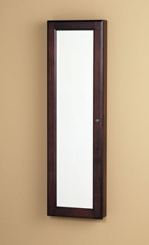 Studio : Southern Enterprises, Inc. Publisher : Southern Enterprises, Inc. Binding : Kitchen Product Description Keep a vast array of accessories secure and organized in this transitional wall mount jewelry mirror. The front beveled mirror adds elegance to the rich cherry finish. Black felt lined interior offers double, single, and flat hanging hooks for necklaces or bracelets, earring notches, cushioned ring rows, and storage bins in a removable tray. This gorgeous piece also features a key locking mechanism and includes 3 screw holes for wall mounting. Dimensions include: Overall: 14.5" W x 4.25" D x 48.25" H; Storage: 6 double hooks, 22 flat hooks, 10 single hooks, 30 earring notches, 8 cushioned ring holders, and 4 bins; Mirror: 9.75" W x 43" H; Ring rows: 7.5" W; Bins: 2.25" W x 1.5" D x 1" H. This one-of-a-kind item weighs approximately 33.5 pounds. Only quality materials and manufacturing will do. Product materials include: Chinese oak, plywood, felt, 3mm mirror w/ .25" bevel, metal. Assembly: No assembly required; ready to hang. Made in China 0