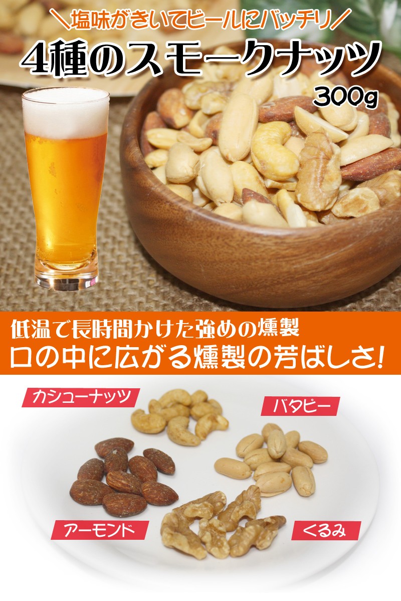 バタピーとアーモンド、くるみ、カシューナッツを燻製にすることによりナッツ自体の旨さを引き立たせ、燻製の香りと噛んだときの口に広がる芳ばしさ、そして後に残る香りは今までのナッツの概念を変えてしまうどのインパクトのある仕上りとしました。 低温で長時間かけて強めの燻製にしておりますので、お酒で鈍った味覚にも芳ばしい刺激を与え続けますのでいつまでもお酒を美味しくいただけます。 最初は強い燻製に抵抗を感じますが、慣れてくると通常のナッツが物足りなく感じてくるほどクセになる仕上がりになっています。