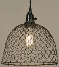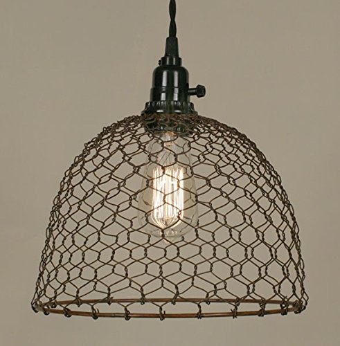 Chicken Wire Dome Pendant Light 10" Diameter x 10-3/4" Tall Priced and sold individually. Plugs into any wall outlet. Shown with our 40 watt vintage bulb, not included. Our pendant lamps include it all: 15½ foot cloth-covered lamp cord with switched socket, two finished ceiling hooks, two cord clamps for adjusting the height of the lamp and easy-to-follow instructions. Add our option of pulleys for a really nice industrial look. These lamps plug into any wall outlet; no wiring required. Designed and manufactured by Colonial Tin Works.Feature