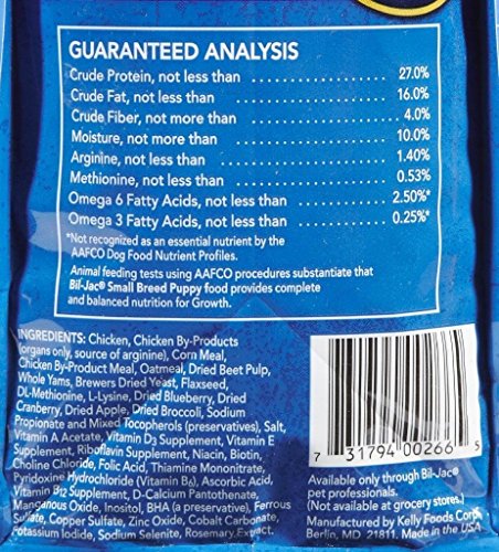 Bil Jac® Small Breed Puppy Dry Dog Food When you feed Bil-Jac Super Premium Dog Food to your dog, he'll start wearing his best coat. One that's shiny, lustrous, and full. Because he's eating healthier, he'll also have softer skin, brighter eyes, increased activity, improved muscle tone and, believe it or not, a smaller & firmer stool - a sign that he's getting all the vital nutrients he needs. Carefully formulated for the care and nutrition of Small Breed Puppies. We've lowered the fat and protein vs. our standard puppy food. Features: · Unique Processing, no sprayed-on rendered fat added and it may eliminate "allergic" symptoms dogs exhibit when carbohydrates in their diet are not properly processed · More Real Chicken and Chicken Organs than other leading brands · Never use Grain gluten meals or Grain protein concentrates as a source of protein · Use of carbohydrates is to provide balance and energy-not as a substitute for protein · No Corn Gluten Meal in any formulas · Finely grown Corn Meal is slowly cooked for over 40 minutes to make carbohydrates more digestible · Gentle moisture removal (vacuum drying) to help avoid heat damage to essential amino acids · Great taste, Easy to digest · Includes Omega-3 and Omega-6 Fatty acids · 4 pounds of real chicken in every 6 pound bag Item Specifications: Size: 6lb Style: Small Breed Puppy-Chicken Key Ingredients: Chicken, Chicken By-Products (organs only, source of arginine), Corn Meal, Chicken By-Product Meal, Dried Beet Pulp, Oatmeal, Whole Yams, Brewers Dried Yeast and Flaxseed. GUARANTEED ANALYSIS: Crude Protein, not less than 26.0% Crude Fat, not less than 15.0% Crude Fiber, not more than 4.0% Moisture, not more than 10.0% Arginine, not less than 1.25% Leucine, not less than 1.50% Lysine, not less than 1.10% Methionine, not less than 0.50% Omega-6 Fatty Acids, not less than 2.70%* Omega-3 Fatty Acids, not less than 0.30%* *Not recognized as an essential nutrient by the AAFCO Dog Food Nutrient ProfileswFeature