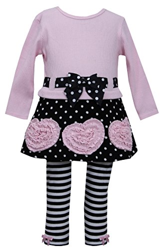 -. Binding : Apparel -. Brand : Bonnie Jean -. Color : Pink -. Department : girls -. Feature : Adorable 2-piece dress & leggging set from Bonnie Jean. / Dress features solid pink rib knit bodice with long sleeves, black white dot ribbon pull through out & a bow trim at drop waist. Attached the black white dotted corduroy skirt with pink bonaz ruched hearts applique' on the front. Comes with a coordinatingblack white stripe leggings with bow bot. / Outfit is a mixtures of cotton, and spandex. / A warm and stylish little dress outfit for your little one to wear during this coming up season. / Bonnie Jean is a great brand sold in high end department stores. -. ProductGroup : Apparel -. ProductTypeName : SHIRT -. Title : Bonnie Jean Girls Bonaz Heart Fall Winter Dress Legging Outfit, Pink, 2T - 6X