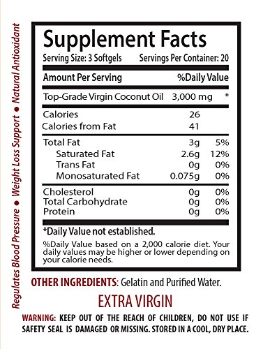 -. Feature : EXTRA VIRGIN COCONUT OIL 3000mg: Well, this wonder oil benefits in skin care, hair care, weight loss, fight off fungi, supporting digestion and increasing immunity system functions. The oil is used not just in tropical countries, where coconut plantations are abundant, but also in the US, Canada, Europe and Australia. People are discovering the wonders this oil can create and it is again gaining popularity throughout the world. / EXTRA VIRGIN COCONUT OIL 3000mg - SUPPORT IMMUNE SYSTEM FUNCTIONS: It can be beneficial for strengthening the immune system functions because it contains antimicrobial lipids, lauric acid, caP.R.Ic acid and caprylic acid, which have anti-fungal, antibacterial and antiviral properties. / EXTRA VIRGIN COCONUT OIL 3000mg - HEARTH AND BLOOD PRESSURE SUPPORT: Coconut oil is high in natural saturated fats. Saturated fats can be helpful not only for increasing the healthy cholesterol (known as HDL cholesterol), but also can help convert the LDL "bad" cholesterol into good cholesterols. By Increasing the HDL cholesterol, it can helps support heart health and normal level of blood pressure. / EXTRA VIRGIN COCONUT OIL 3000mg - NATURAL APPETITE SUPPRESSANT: Studies have shown that the MCTs in coconut oil can be beneficial for increasing feelings of fullness more than other fats, leading to a reduction in total calorie intake. / OUR GUARANTEE: PREMIUM QUALITY SUPPLEMENT PROUDLY MANUFACTURED IN THE USA! We use only the very best ingredients, all of which are manufactured in state-of-the-art facilities, with strict adherence to good manufacturing practices (GMP).