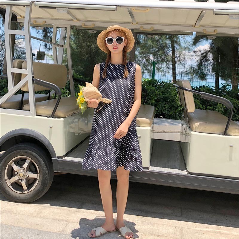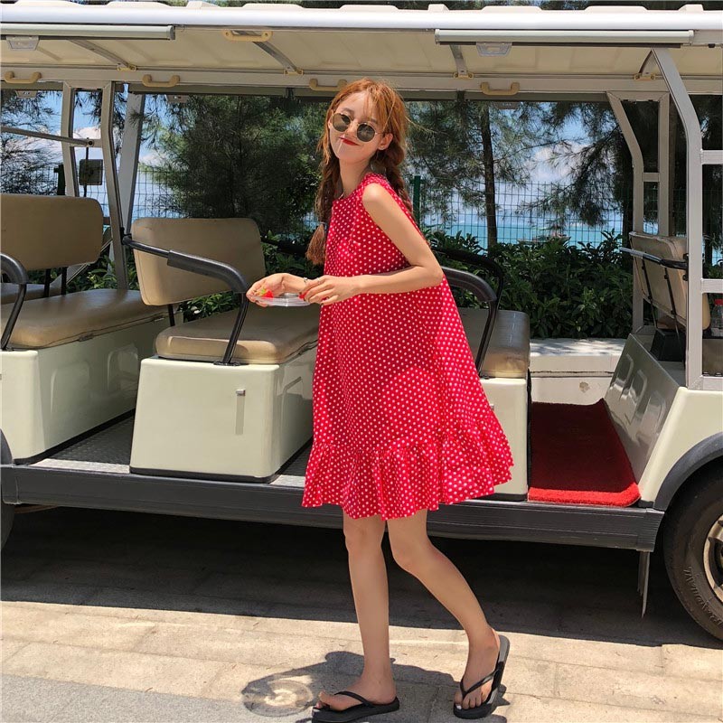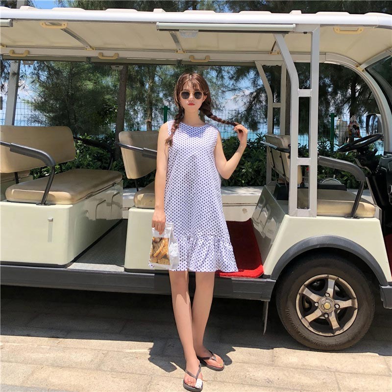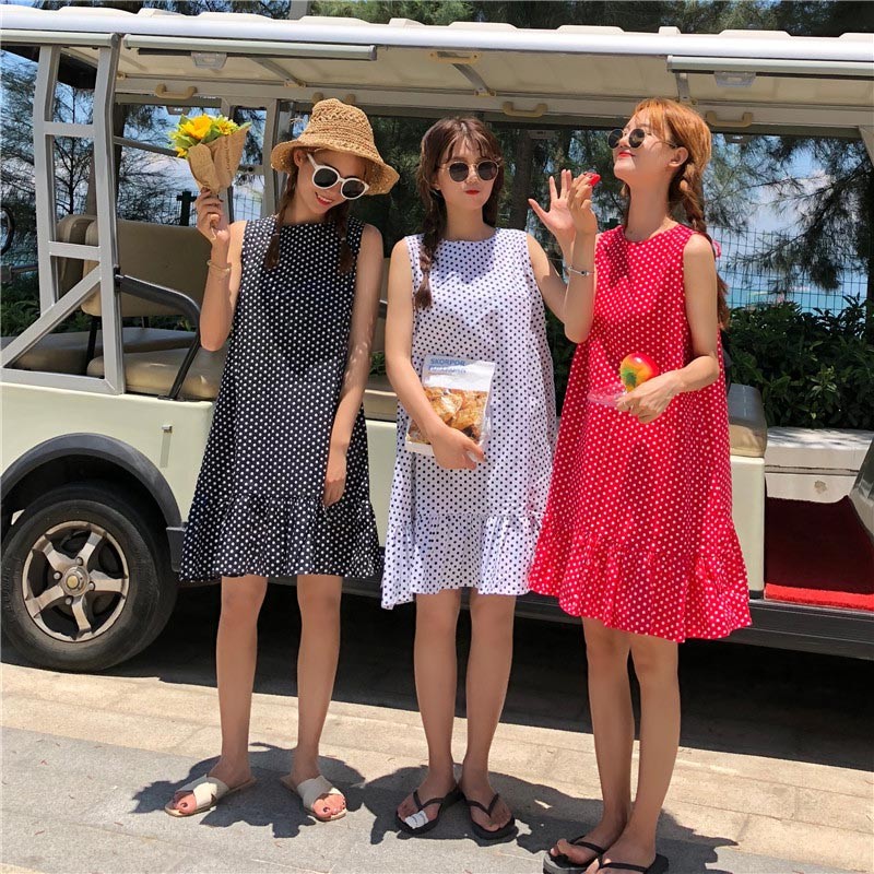 レトロなドットプリント柄の裾フレア・後ろネックリボンデザインワンピース♪