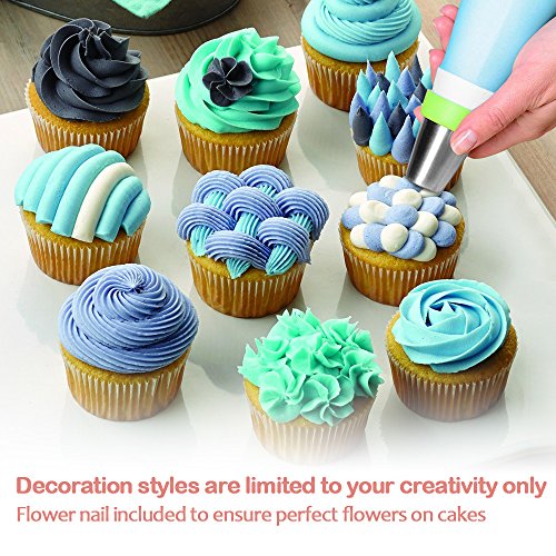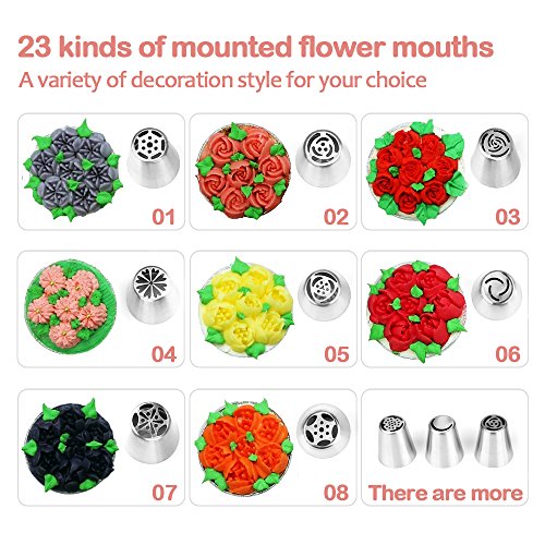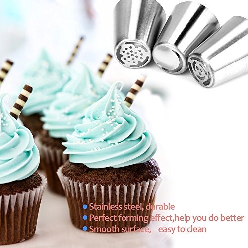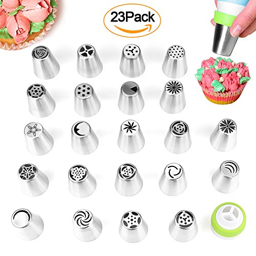 - BEST BAKING SUPPLIES: decorate like a PRO! You’ll have everything you need to start decorating your cakes, muffins, cupcakes and cookies with a professional touch. This cake decorating kit comes with 23 icing Russian tips, 15 pastry bags, and a coupler, designed for the baking veteran or newbie.