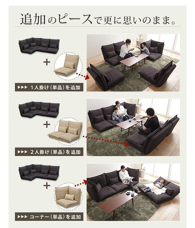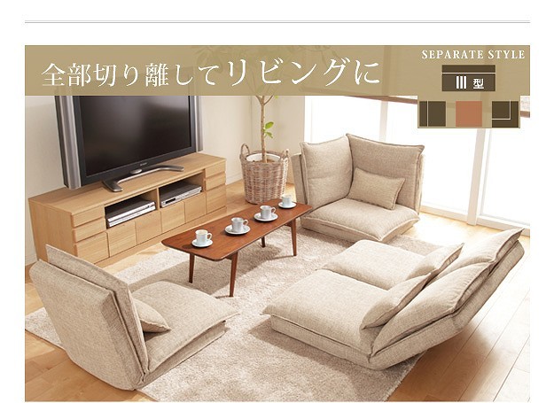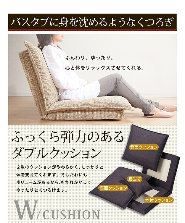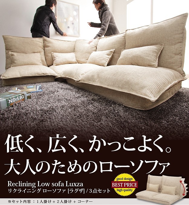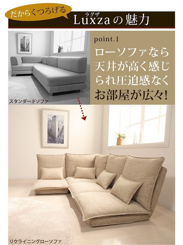 ハイバックのリクライニングローソファ。14段階のリクライニング(コーナーはリクライニング非対応)でお好みのくつろぎスタイルに。セパレートタイプなので、レイアウトをお楽しみいただけます。ふっくらボリュームのあるダブルクッションは抜群の座り心地☆大手自動車会社にもパーツを提供している老舗の科学メーカーが「楽な座り姿勢」のノウハウを活かしてつくりました。上質で丈夫なカバーは立体的な織目。座面、背もたれ、腰当てクッションのカバーは外してドライクリーニングが可能なので、清潔に保てます。