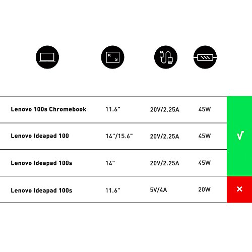 -. Feature : International Safety Certification:Our products have passed the UL/TUV CE / FCC / RoHS test and Got the certificates.Approved for Sale in the US and Canada by Underwriters Laboratories (UL). UL number assigned to this HKY product is unique and could be verified on UL website(UL Number:E482580). UL LLC is an American worldwide safety consulting and certification company approved to perform safety testing by the US federal agency Occupational Safety and Health Administration (OSHA) / 100% OEM Compatible,More Safety Than Others:This adapters was made with the highest quality materials.V-0 grade flame retardant,OVP, OCP, SCP Protection (OVP: Over Voltage output Protection. OCP: Over Current output Protection. SCP: Short Circuit output Protection) / Input:100-240V,50-60Hz;Output:20V 2.25A 45W (If you want to find 5V 4A Lenovo Ideapad 100S Laptop Charger ,pls search B01MQ4RUVB ));7.5FT Cable Include;Warranty: 30 Days Money Back Guarantee/12 Months Warranty / Compatibility:Lenovo 100s Chromebook 11.6";Lenovo Ideapad 100s 14";Lenovo ideapad 100 14"/15.6" laotop;Lenovo 100-15IBY 100-14IBY 100-15IBD 80MJ00AEUS 80QQ00JGUS PA-1450-55LN PA-1450-55LR,Lenovo Ideapad Yoga 45W 20V 2.25A AC Adapter ADL45WCC 5A10H43625(NOTE:IT'S NOT FIT LENOVO IDEAPAD 100S 11.6" LAPTOP) ;Lenovo N22 N22-20 Touch Chromebook/Winbook, IdeaPad/ThinkPad N22 / ABSOLUTE ENERGY-SAVING: It's a fact- our adapter has been constructed according to the latest requirements of level VI energy efficiency,Maximize your adapter's usage while spending the minimum amounts of energy! Save money now- as all the energy will be efficiently used without unnecessary loss.The most cost-effective adapter is here- get it now without thinking too much!