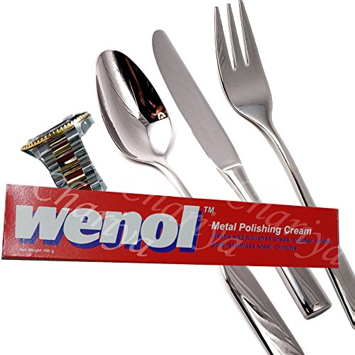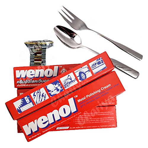 -. Feature : Wenol polishes and preserves all blank metal surfaces such as brass, silver, copper, chrome, aluminium, pewter stainless and enamel. / Wenol can be used on most any metal to remove tough stains, oxidation, acid rain spots, and surface rust. / Wenol is very gentle to metal surfaces and gives a sparkling shine. / Don't believe it until use by yourself. / Quantity : 1 Pc (Only Wenol) Net Weight : 50 gram.