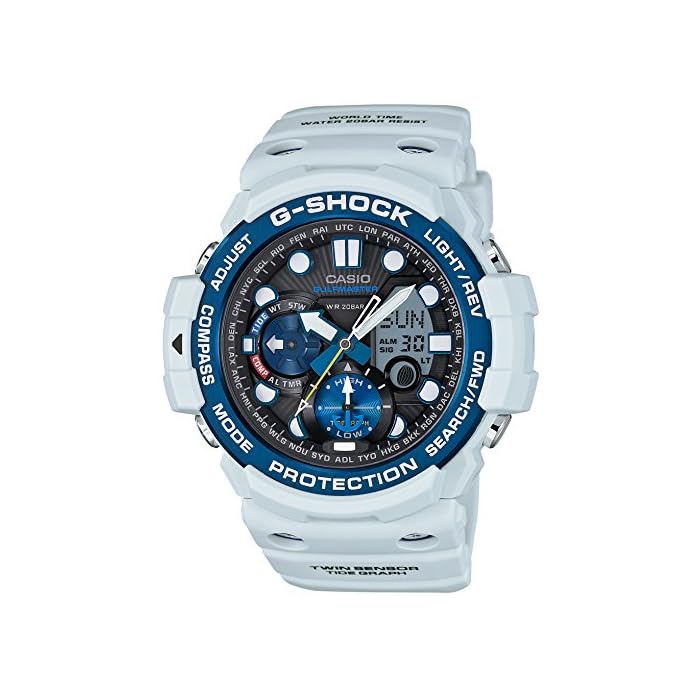 The set includes: body, box, instruction manual, warranty card is enhanced waterproof accessories for daily life in the instruction manual: 20BAR Country of origin: Thailand Shock structure Auto LED Light (Super Illuminator, afterglow function, switching afterglow time (1.5 seconds / 3 seconds) with) G-SHOCK ([model number: GN1000C8AJF] GULFMASTER). Course, such as when the mission is 60 seconds or continuous measurement possible direction measurement function that can be confirmed at sea, was also equipped with temperature measurement functions that are important at the time of unforeseen circumstances. In addition Tide graph ebb can check the tide, the old display, equipped with a moon data to be displayed in graphics, and supports a wide range of activities at sea. Furthermore, temporarily retracted from the current pointer position the hour and minute hands with one push, equipped with needle retraction function of the liquid crystal display can be read. The combination of the band soft urethane band, improve the fit to the arm. It has undergone a superior IP processing in wear resistance to the bezel of the stainless steel portion. Also finished with a marine taste full of design by applying the blue everywhere. Up to the function and design, it is the emergence of New Gulf master for the men of the sea to work in harsh environment. [Model Number: GN1000C8AJF] ■ Gender: Unisex ■ Material: Resin / Stainless steel - Belts: Resin glass: mineral glass ■ function: digital / analog-type (quartz type), 20 ATM water resistant Made in Thailand