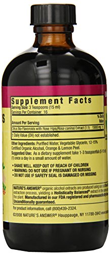 -. Binding : Health and Beauty -. Brand : Nature's Answer -. EAN : 6935743513255 -. Feature : 1:1 extract / Promotes blood vessel integrity / Herbal supplement -. IsAdultProduct : 0 -. Label : Nature's Answer -. LegalDisclaimer : * These statements have not been evaluated by the Food and Drug Administration. This product is not intended to diagnose, treat, cure or prevent any disease. ** Always refer to the manufacturer's label on the product for description, recommended dose and precautions. -. Manufacturer : Nature's Answer -. Model : 719963 -. MPN : 083000008382 -. NumberOfItems : 1 -. PackageQuantity : 1 -. PartNumber : 083000008382 -. ProductGroup : Health and Beauty -. ProductTypeName : HEALTH_PERSONAL_CARE -. PublicationDate : 2010-11-24 -. Publisher : Nature's Answer -. Size : 8 oz -. Studio : Nature's Answer -. Title : Nature's Answer Bio-Flavonoids and Rose Hips with Organic Alcohol, 8-Fluid Ounces -. UPC : 731646339475