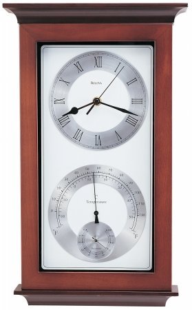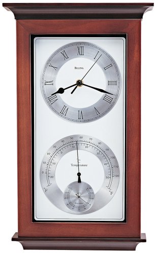 Studio : Bulova Publisher : Bulova Binding : Misc. Product Description Yarmouth Maritime Clock in solid wood case in walnut finish with solid wood top and base in mahogany finish. Features decorative black accents and white metal dial with spun aluminum chapter rings. Clock includes hygrometer and thermometer. 0