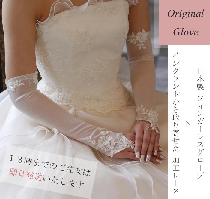 グローブ専門メーカーの日本製フィンガーレスグローブに、イングランドより輸入したビーズ加工レースをプラスした、オリジナル商品です。