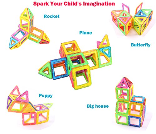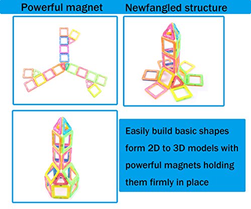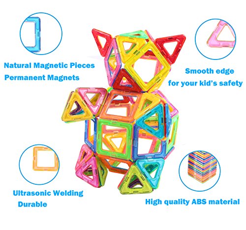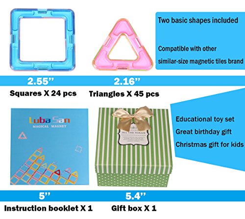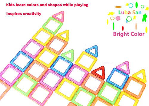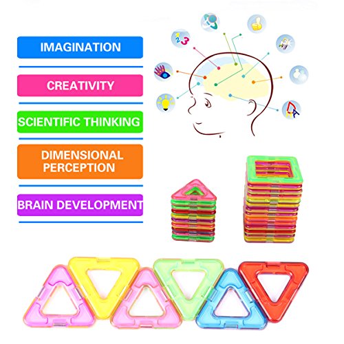 -. Feature : [Educational Toy] The magnetic blocks sets can help your kid to encourage creativity, brain development and critical thinking.It's a great toy that can provide hours of creative play with your kids / [Safe & High Quality] The magnets block toys use high quality original ABS material, all rainbow color pieces have been through ultrasonic process for better tightness, perfectly prevent breaking apart. Make it safe to DIY for chid with smooth hand-feeling. / [More Than Fun For Kids] With power megnetic tiles and vibrant rainbow colors, the magnetic buliding blocks can easy connect to DIY building models as children like / [Spark Your Child's Imagination] All children aged 3 or up will enjoy the colorful world they can create with this set. The pieces are durable and safe so they can be used again and again to spark your child's imagination / [Learn & Play] If you are looking for a way to connect with your child and have fun, this is a must-have gift. This magnetic blocks toy set comes with 69 pieces total, 24 squares and 45 traingles.More pieces in box with lower price.You will love the pride you see in your child's face when they creates a new design. A toy that helps them learn is really the best of both worlds.