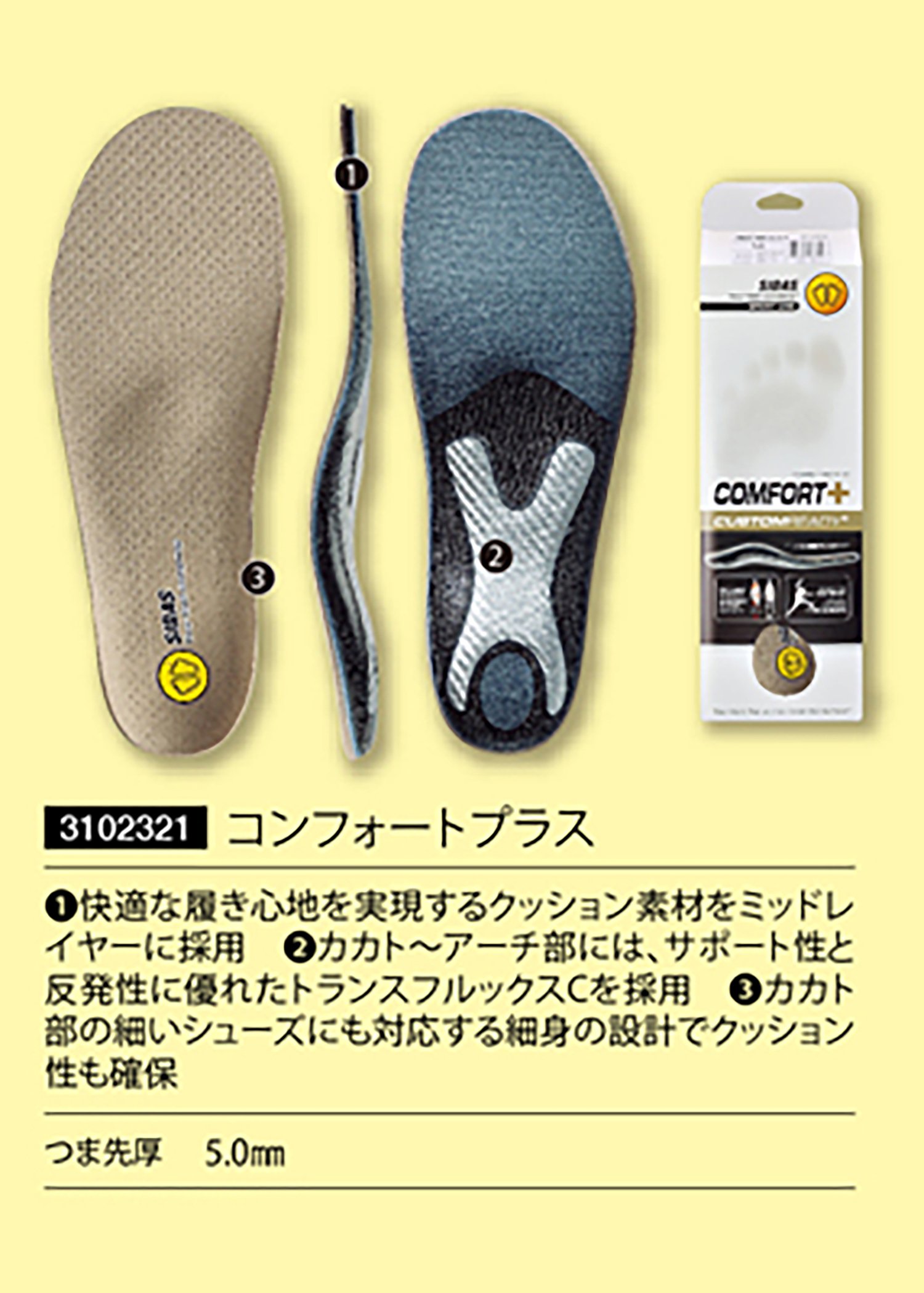 ● Secure cushioning with slim design that also corresponds to thin shoes in the crown.