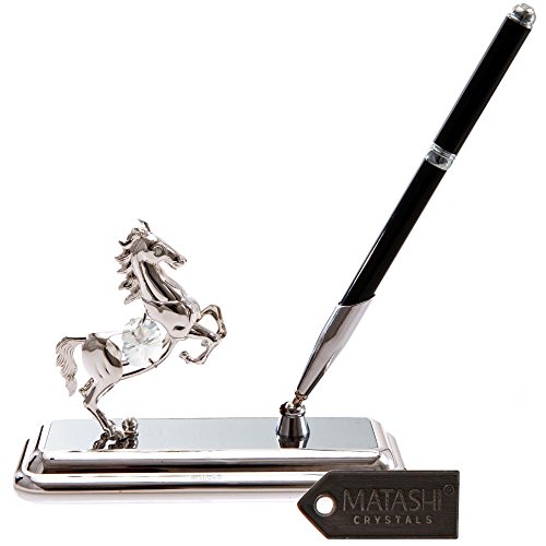 [Product Information]- EYE-CATCHING DESIGN: A twist-to-open crystal topped pen rests in a swiveling holster, on a Silver inlaid base. Alongside, sits an ornate Silver Horse Pen Set figurine. Crafted with quality materials like tarnish-resistant Silver, and precision cut Matashi® crystals.