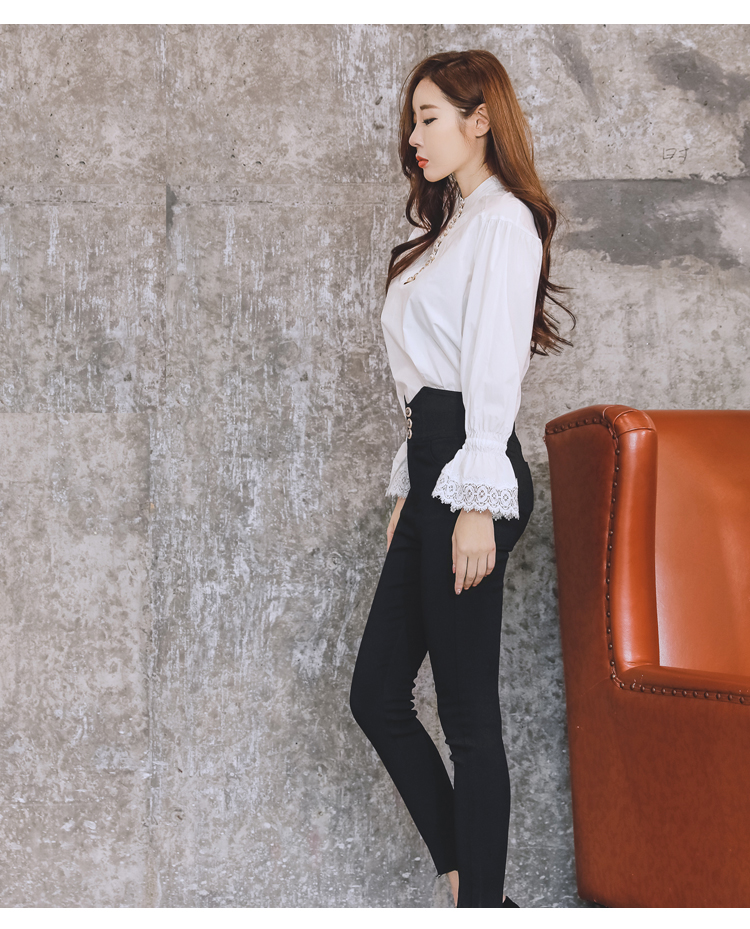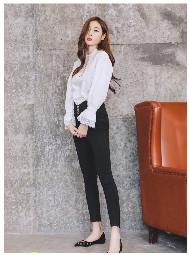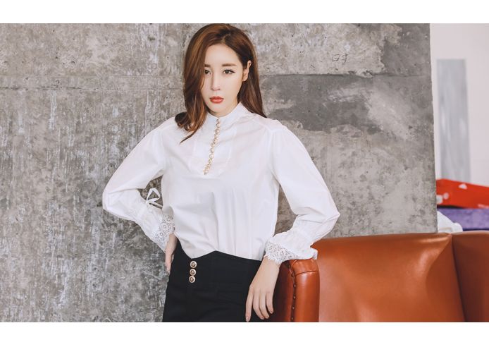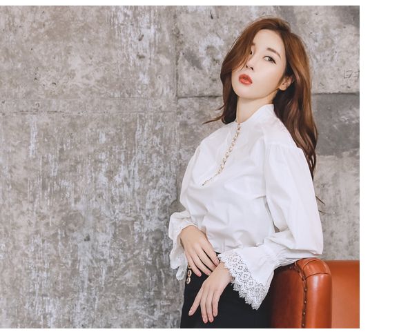 首元の露出は抑えつつ、控えめなキャンディスリーブと袖口のレースで甘さを演出。