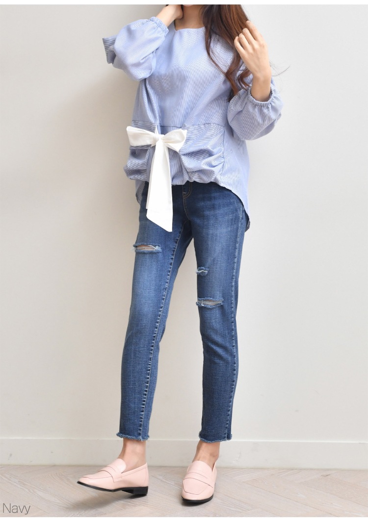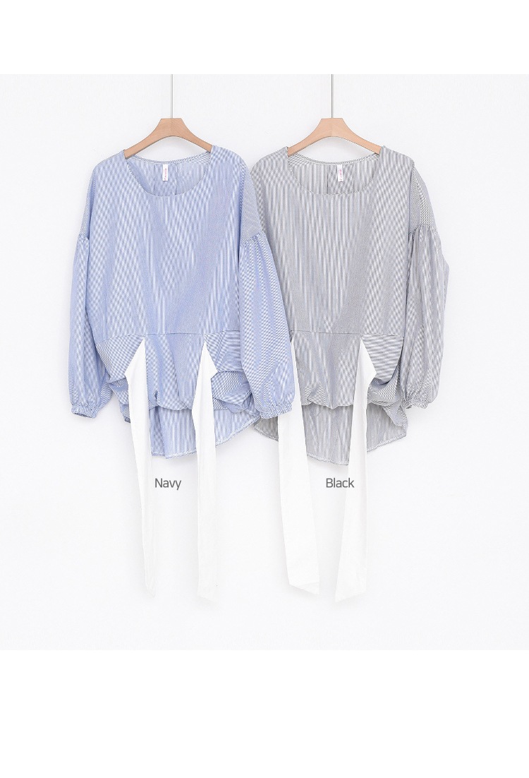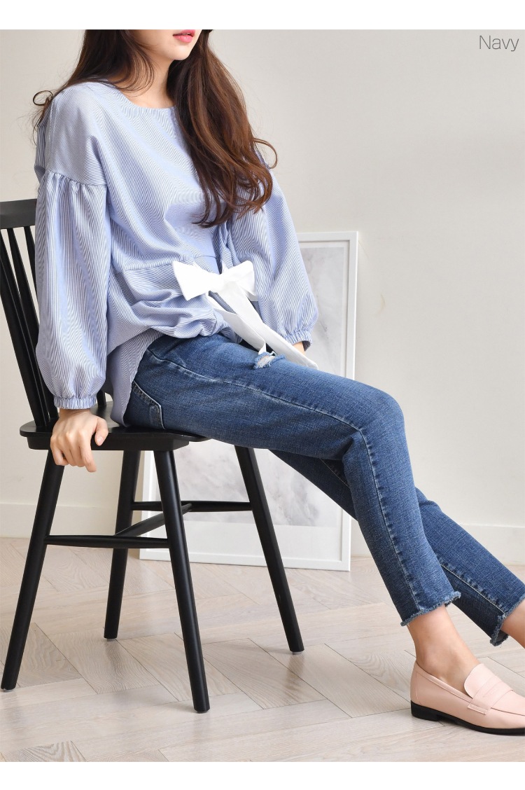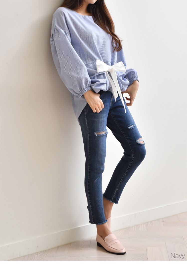 ウエストで結んだリボンが目を引く女性らしい雰囲気のブラウス☆