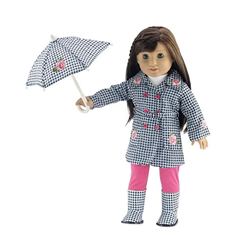 -. Feature : Made to fit 18 Inch dolls such as American Girl, Madame Alexander, Our Generation, Gotz, etc. / Gift-Boxed! Packaged in classy pink gift box with Emily Rose logo. / Gorgeous, one of a kind black and white Hounds tooth 18" doll raincoat with pink English rose appliqués, real belt, and bright pink faux buttons, perfect for keeping dry on a rainy day! / Ultra chic outfit also includes white long-sleeved t-shirt, bright pink leggings, and matching black and white hound's-tooth rain boots and real functioning umbrella! / Designed and manufactured by Emily Rose Doll ClothesTM. Luxurious high quality fabrics, washable, safety tested.