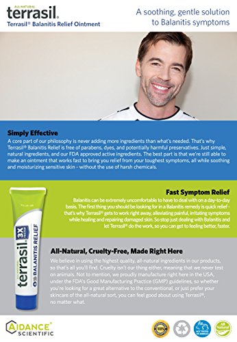 An effective, All-Natural Solution to Balanitis Dealing with Balanitis can be tough, and harsh chemicals, soaps or detergents can only make the problem worse. That's why Terrasil Balanitis Relief uses only gentle, natural ingredients known to bring relief from irritation, redness, inflammation and itching. Terrasil also works to moisturize and repair damaged skin, so you'll be left feeling better than before. Yes, Terrasil Really Works ? Calms redness, inflammation, and discomfort ? Stops itching ? Reduces the risk of infection, promoting faster healing ? Completely pain-free formula will not irritate skin