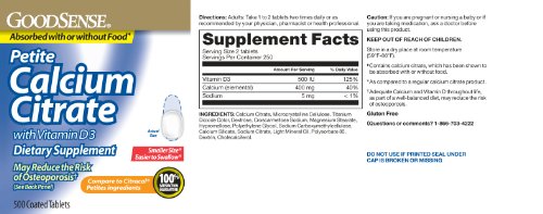 -. Binding : Health and Beauty -. Brand : Good Sense -. EAN : 0070030127640 -. Feature : Compare to ingredients of Citracal Petites / Dietary Supplement / Bone Health. This statement has not been evaluated by the Food and Drug Administration. This product is not intended to diagnose, treat, cure, or prevent any disease. / Absorbed with or without food. Contains calcium citrate, which has been shown to be absorbed with or without food. / Smaller size, easier to swallow. As compared to a regular calcium citrate product. -. IsAdultProduct : 0 -. Label : Good Sense -. Manufacturer : Good Sense -. NumberOfItems : 1 -. PackageQuantity : 1 -. ProductGroup : Health and Beauty -. ProductTypeName : HEALTH_PERSONAL_CARE -. PublicationDate : 2013-11-06 -. Publisher : Good Sense -. ReleaseDate : 2013-11-03 -. Studio : Good Sense -. Title : GoodSense Petite Calcium Citrate with Vitamin D3, 500 Count -. UPC : 070030127640