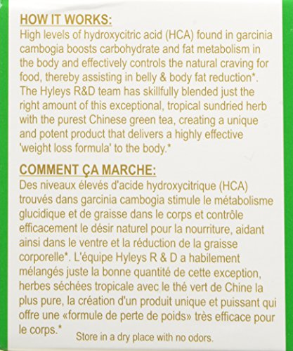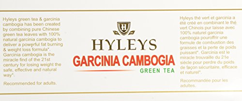 -. Feature : 1. Effectively burns belly & body fat*2. Increases metabolism*3. Suppresses food cravings*4. Contains vital nutrients potassium, calcium & vitamin C*5. Support healthy digestion & regular bowel movement* / Directions: Pour 8 oz. freshly boiled water over a tea bag in a cup. Cover and steep 5-8 minutes. These steps directly influence the amount of beneficial components that end up in your tea cup. Gently squeeze the tea bag to release any remaining extract. / How it works: High levels of hydroxycitric acid (HCA) found in garcinia cambogia boosts carbohydrate and fat metabolism in the body and effectively controls the natural craving for food, thereby assisting in belly & body fat reduction. / How to use: For optimum results take one cup of Hyleys Green tea & Garcinia Cambogia 30 minutes P.R.Ior to a meal. / *These statements have not been evaluated by the FDA. This product is not intended to diagnose, treat, cure or prevent any disease.