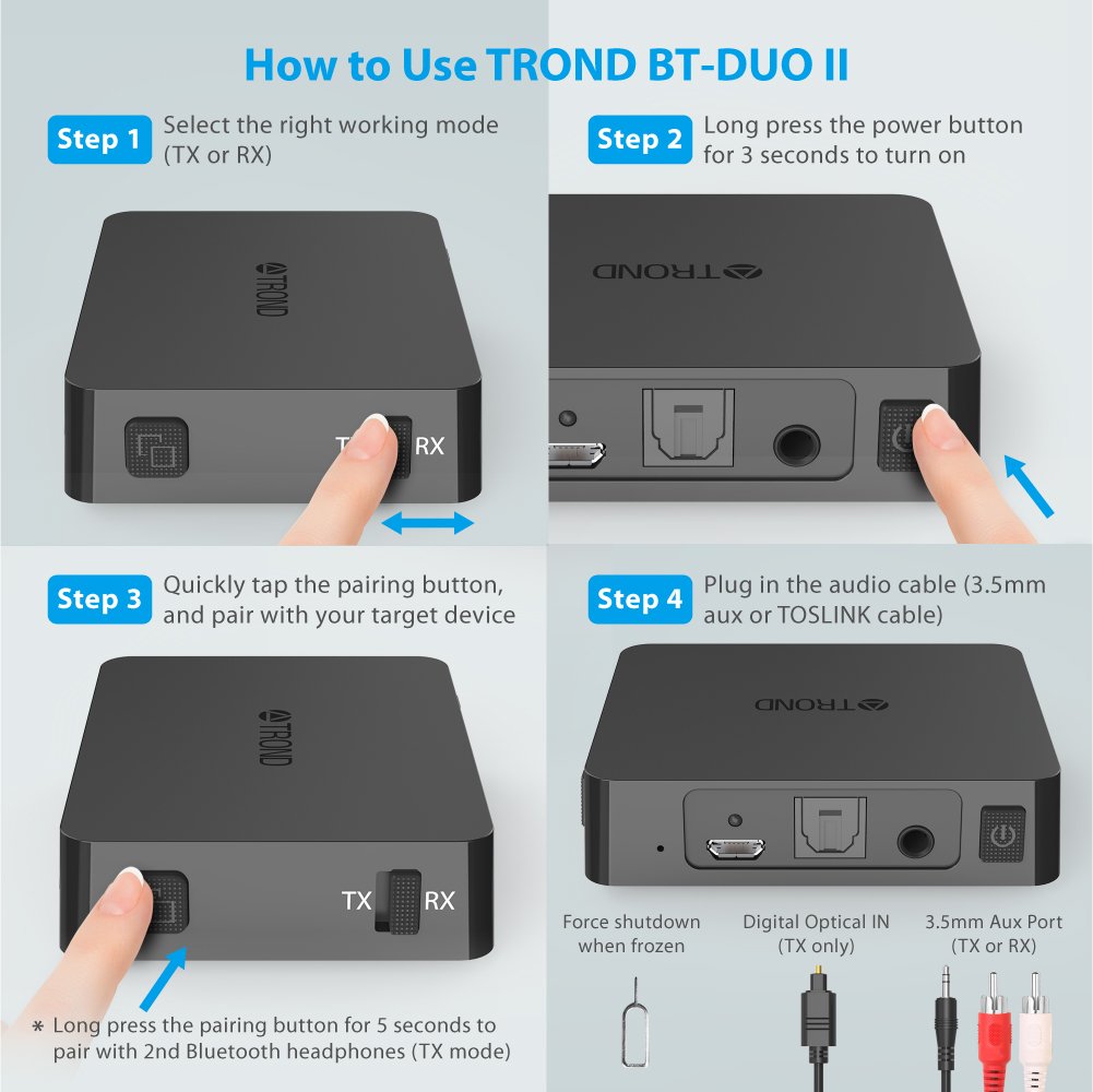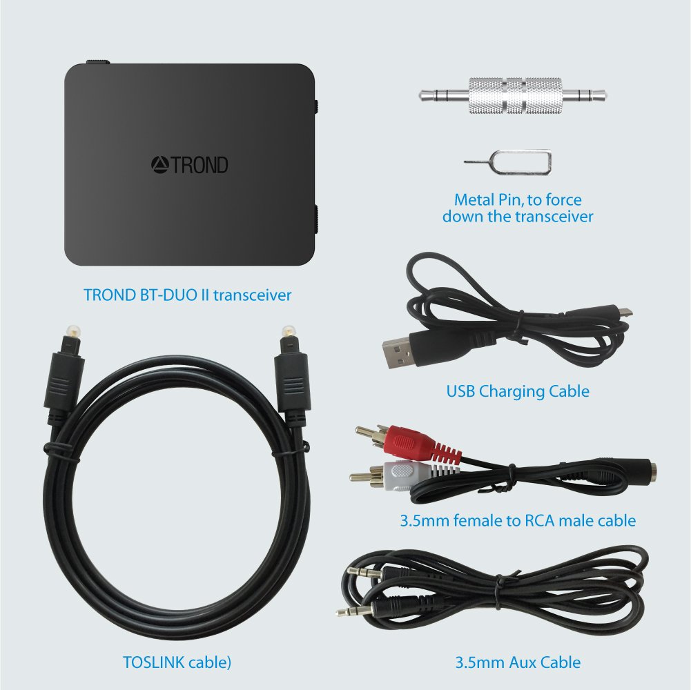 TROND BT - DUO II wirelessly transmits stereo audio from Bluetooth - compatible audio sources such as TV, iPod, PC etc to Bluetooth - compatible headphones, speakers and receivers.