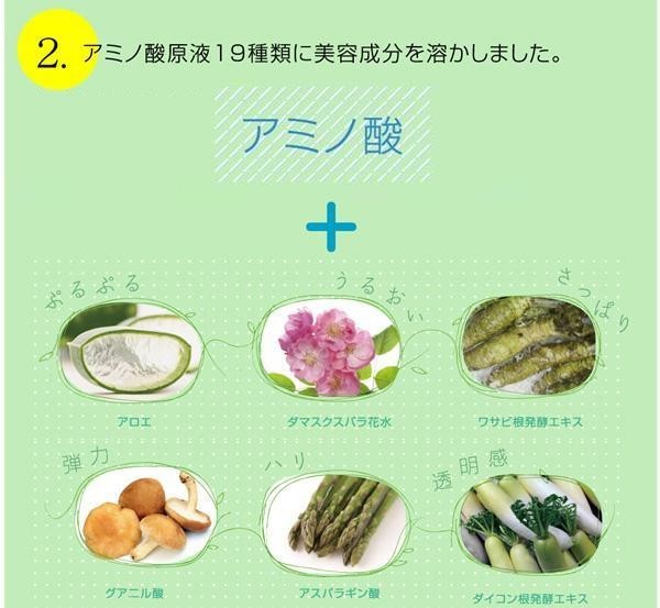 | 成分 | 水、グリセリン、ペンチレングリコール、キサンタンガム、ダマスクバラ花水、レウコノストック、ダイコン根発酵液、シロキクラゲ多糖体、アロエベラ液什末、乳酸棹菌、ワサビ根発酵エキス、セイヨウシロヤナギ樹皮エキス、タウリン、サリックス二グラ樹皮エキス、リシンHCL、グルタミン酸、ロイシン、グリシン、ヒスチジンHCL、セリン、バリン、アスパラギン酸Na、トレオニン、アラニン、イソロイシン、アラントイン、フェニルアラニン、アルギニン、プロリン、チロシン、イノシン酸2Na、グア二ル酸2Na |