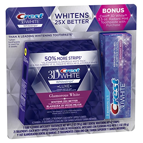 Crest 3D White Glamorous White strips uses revolutionary Advanced Seal technology. This groundbreaking adhesive formulation holds the White strips in place so you can whistle along with the radio, take a shower and even drink water while you whiten! Formulated with the same enamel-safe whitening ingredient dentists use, this teeth whitening system removes surface stains and those below the tooth's surface. Apply Crest 3D White Glamorous White strips for 14 days (once a day for 30 minutes) and get whiter teeth that last.Feature