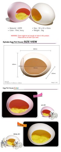 -. Binding : Misc. -. Brand : Pet Ocean -. Color : Pink -. EAN : 0650905115233 -. Feature : Egg shape portable house / It comes with cushion (random color) inside / Can be easily placed in your pet's favorite bed / House size is 59cm x 43cm x 43cm with 3kg / Materials made is High-density polyethylene -. Label : Pet Ocean -. Manufacturer : Pet Ocean -. MPN : 35351 -. PackageQuantity : 1 -. PartNumber : 35351 -. ProductGroup : Pet Products -. ProductTypeName : PET_SUPPLIES -. Publisher : Pet Ocean -. Size : 59cm x 43cm x 43cm -. Studio : Pet Ocean -. Title : Dog Cat Puppy Kitty Bed Pink Egg Shape House Kennel Potable Pet House Supplies -. UPC : 650905115233