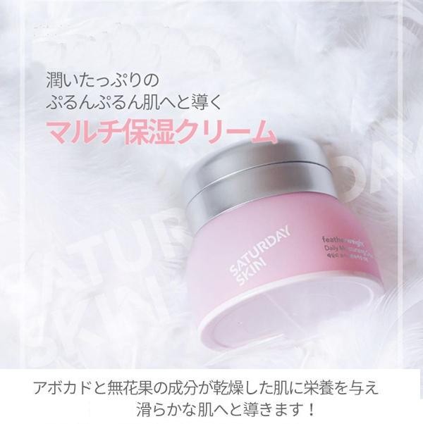 軽いつけ心地なのに肌はぷるぷる。ハリやキメも整えるマルチ保湿クリームです。サルフェート・パラベンフリーです。 製造国:韓国 内容量:50ml ※サプライヤー直送品【商品名】韓国コスメ Saturday skin サタデースキン デイリーモイスチャーライジングクリーム(保湿クリーム) 50ml