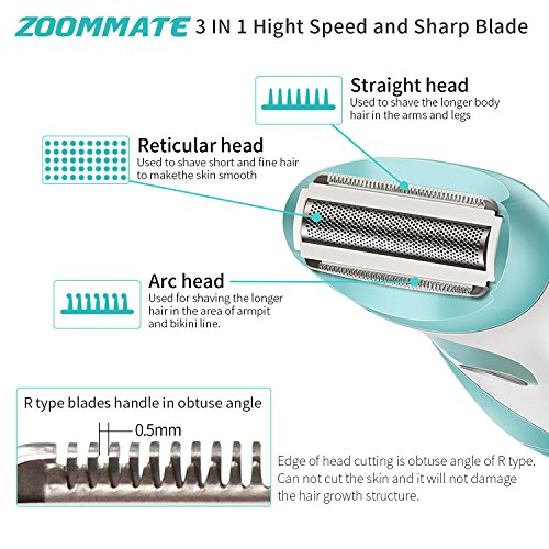 - [Efficient and Safety] Zoommate professional women's electric razor with 3 in 1 blade technology and built- in high speed motor helps you to remove the excess hair efficiently, rapidly and thoroughly, makes you always get the smooth silky skin.