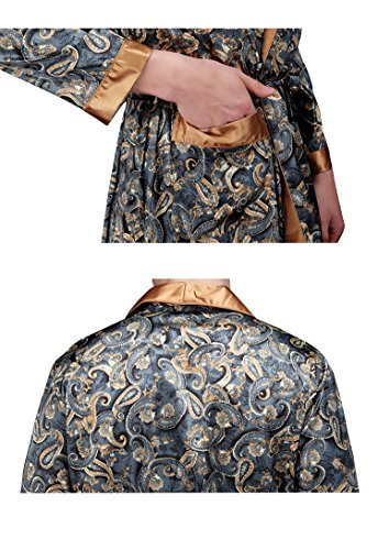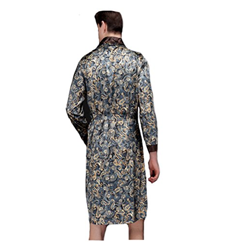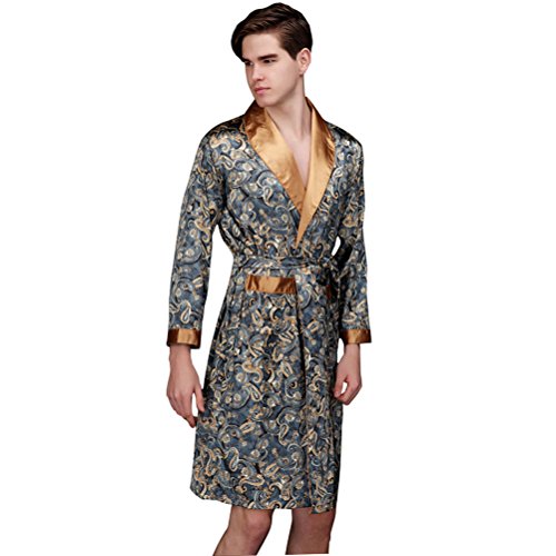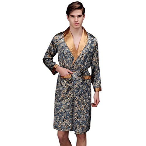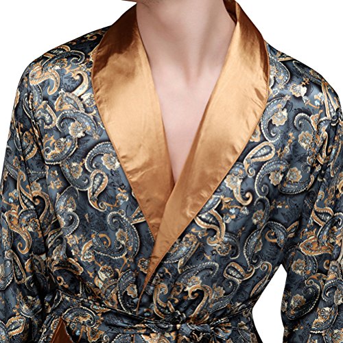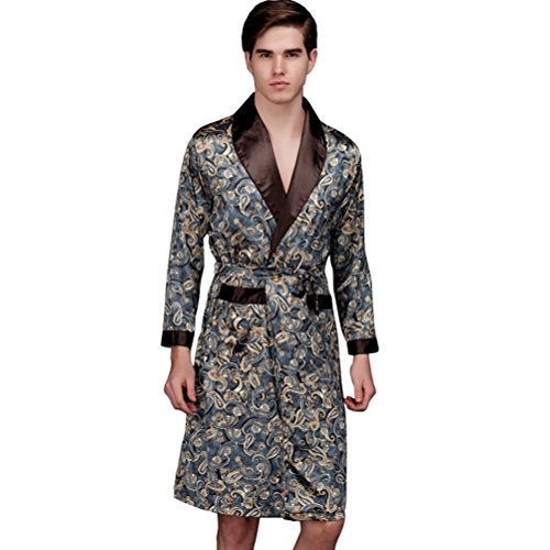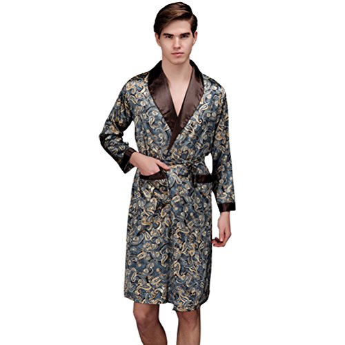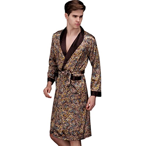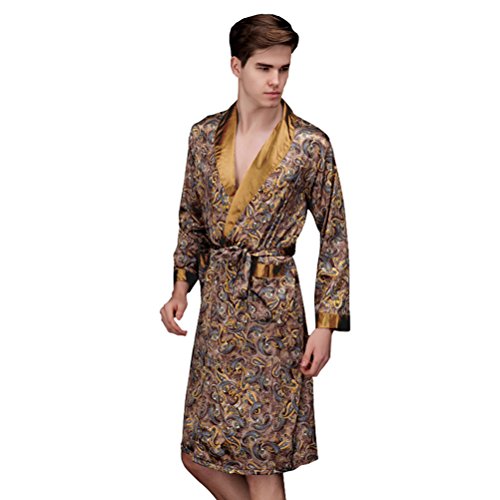 Binding : Apparel Product Description WPY Men's Kimono Robe Shawl Collar Knee Length Printed Satin Robes Material:Imitation silk Color:Brown,Champagne,NavyBrown, NavyChampagne Size measurement:? XL:Length----44.46 inches,Chest----22.62 inches,Sleeve Length----22.04 inches,Shoulder----17.55 inches; XXL:Length----45.24 inches,Chest----24.18 inches,Sleeve Length----22.50 inches,Shoulder----17.94 inches Package Includes: 1 x Men's Robe 0