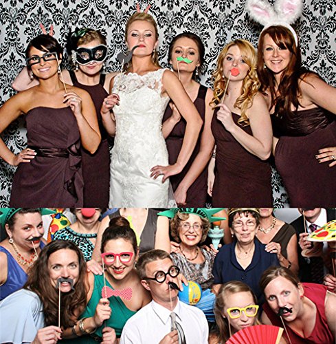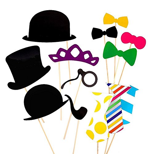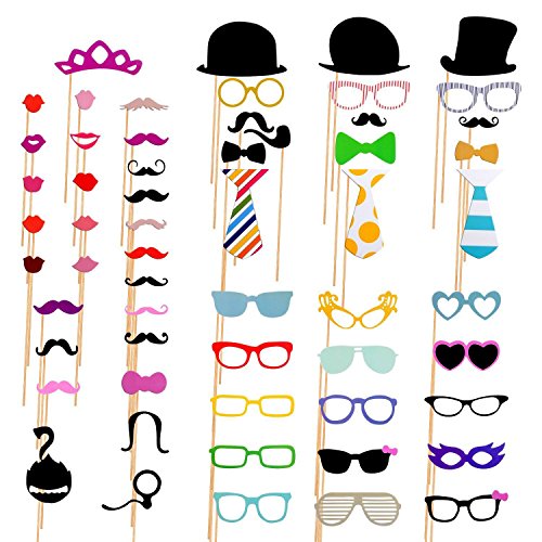 -. Feature : Perfect Combination - 58 pieces photo booth props kit comes with a huge variety of novelty "disguise" props, includes Funny Mustaches, Different Glasses, Red Lips, Party Hats, Colorful Ties, Crowns, Smoking Pipes, and much more. / Easy DIY - simply select whichever props you will be using from your 58 pieces kit, and then glue them to the wooden sticks. / Durable Materials - made from high quality cardstock; Bamboo stick strong toughness, not broken easily; Strong adhesive glue, stickers are more secure, anytime, anywhere, take a photo you want. / Vivid Color - all the props are P.R.Inted on high quality Thick Cardboard in vibrant colors exactly as shown in the product images. / Super Fun - bring huge fun to Birthday Parties, Wedding Parties, Engagement, Graduation Parties, Holiday Parties, Family Reunions etc.