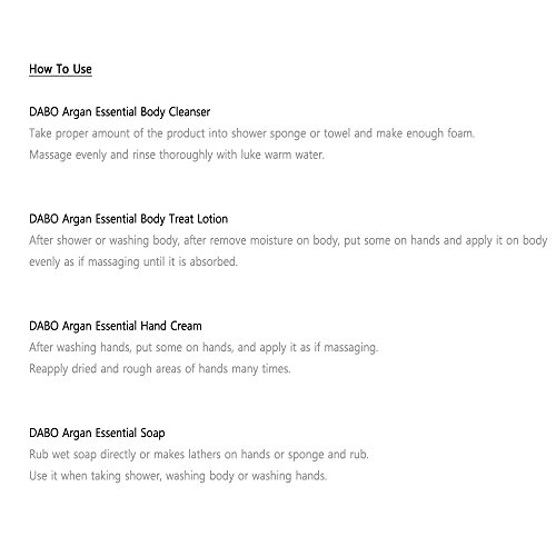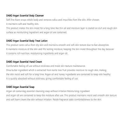 DABO Argan Essential Body Treatment Lotion 350ml(11.8oz) : This product cares callus from dry skin and maintains smooth and soft skin texture due to fast absorption. It maintains moisture of the skin and fills lacking moisture, keeping the skin moist throughout the day because it contains rich nutrition, moisturizing ingredients and argan oil.