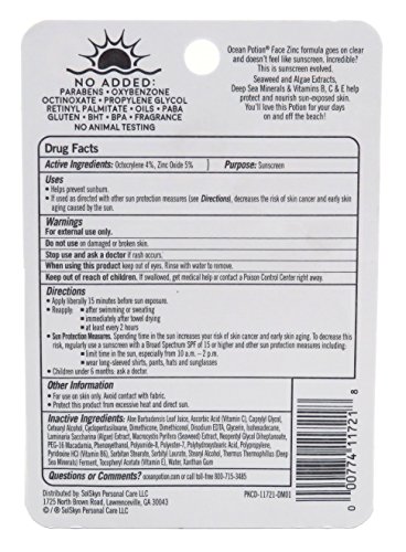 Ocean Potion Face Zinc is ideal for all outdoor activities. This creamy formula is easy to apply, goes on clear and doesn’t feel like sunscreen. Leaving a matte finish immediately upon application, it won’t run into eyes. Perfect for use under cosmetics. This formula helps to protect and nourish sun exposed skin by providing broad spectrum UVA/UVB protection against skin aging and burning caused by the sun and moisturizing benefits from ingredients from the sea, such as Seaweed & Algae Extracts, Deep Sea Minerals and anti-oxidant Vitamins B, C & E.Feature