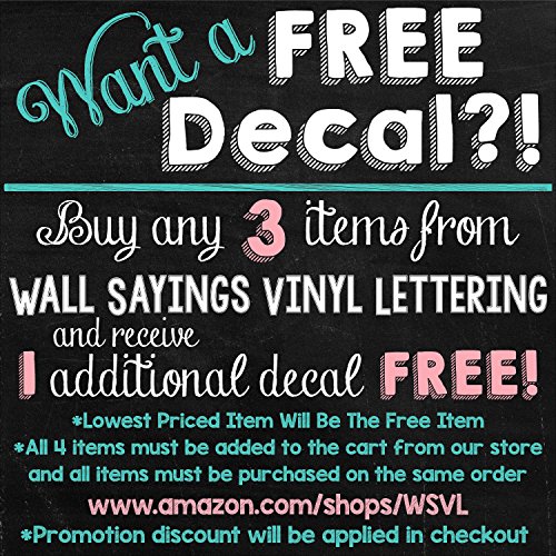 -. Feature : Two different sizes available and lots of great colors - 12"H x 36"L, 16"H x 48"L / All of our colors are a Matte Finish except for our Metallic colors which have a nice subtle shimmer to them but are not glossy. / PLEASE READ: Before clicking "Add to Cart" be sure that it says "Sold by Wall Sayings Vinyl Lettering". Any other sellers listed on this item are doing so illegally because WALL SAYINGS VINYL LETTERING is the manufacturer and we do NOT sell to re-sellers. We cannot guarantee the quality of counterfeit decals.Counterfeit decals can have jagged edges and either do not stick at all or they take the paint off your wall upon removal. We are the manufacturer and the ONLY seller of our products. / This decal is an original design/decal made with HIGH QUALITY vinyl ONLY by WALL SAYINGS VINYL LETTERING. It is made in the USA and only shipped by WALL SAYINGS VINYL LETTERING. This decal is NOT made in China, and will never be shipped by a 3rd party. We have been in business since 2004 and are one of the leading Vinyl Decal sellers in the world. / We have been in business since 2004 and are one of the leading Vinyl Decal sellers in the world. We provide detailed application instructions along with a customer service phone number in case you have any questions about application. Vinyl decals can be used in so many ways, they can be applied straight to a wall or be used on numerous surfaces including by not limited to; wood, metal, plastic, paper, ceramic, and glass. Decals are perfect for crafts, making almost any project easy for all.